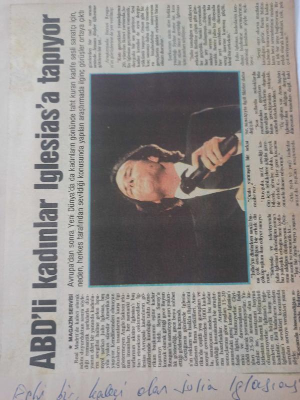 21 Nisan 1984 - ABD'li kadınlar İglesias'a tapıyor - Avrupa'dan sonra Yeni Dünya'da kadınların gönlünde taht kuran kadife sesli sanatçı için, neden, herkes tarafından sevildiği konusunda yapılan araştırmada ilginç görüşler ortaya çıktı - Gazete haberi - Tek Yaprak Arkalı Önlüdür, Erol Duru tarafından kaleme alınmıştır. Kitap 1984 yılında yayınlanmıştır. 2 sayfadır. 21 Nisan 1984 - ABD'li kadınlar İglesias'a tapıyor - Avrupa'dan sonra Yeni Dünya'da kadınların gönlünde taht kuran kadife sesli sanatçı için, neden, herkes tarafından sevildiği konusunda yapılan araştırmada ilginç görüşler ortaya çıktı - Gazete haberi - Tek Yaprak Arkalı Önlüdür adlı eser Türkçe dilindedir.