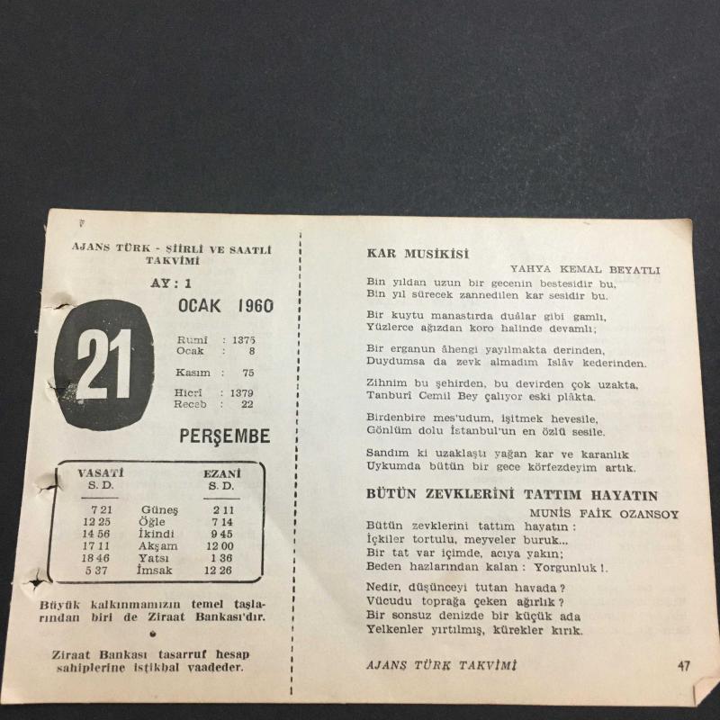 21 OCAK 1960 -TAKVİM YAPRAĞI-DOĞUM GÜNÜ HEDİYESİ-AJANS TÜRK-ŞİİRLİ VE SAATLİ TAKVİMİ,YAHYA KEMAL BEYATLI,MUNİS FAİK OZANSOY,MUZAFFER POLAT,FAL,FIKRA,FRANSA KRALI 16.LUİ NİN İDAMI 1793,GÜZEL SÖZ,YEMEK LİSTESİ, 1 yıl önce satışa sunulmuştur.