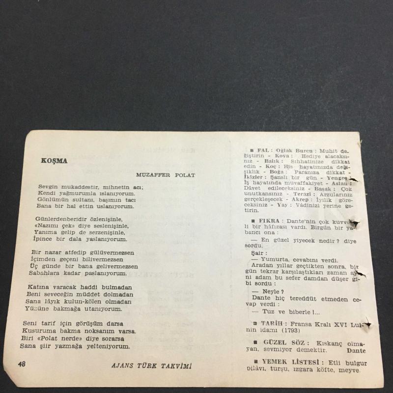 21 OCAK 1960 -TAKVİM YAPRAĞI-DOĞUM GÜNÜ HEDİYESİ-AJANS TÜRK-ŞİİRLİ VE SAATLİ TAKVİMİ,YAHYA KEMAL BEYATLI,MUNİS FAİK OZANSOY,MUZAFFER POLAT,FAL,FIKRA,FRANSA KRALI 16.LUİ NİN İDAMI 1793,GÜZEL SÖZ,YEMEK LİSTESİ başlıklı ürün, Efemera, Müzik, Sinema > Belge ve Evraklar > Takvimler kategorisi altında İkinci El olarak satılmaktadır.