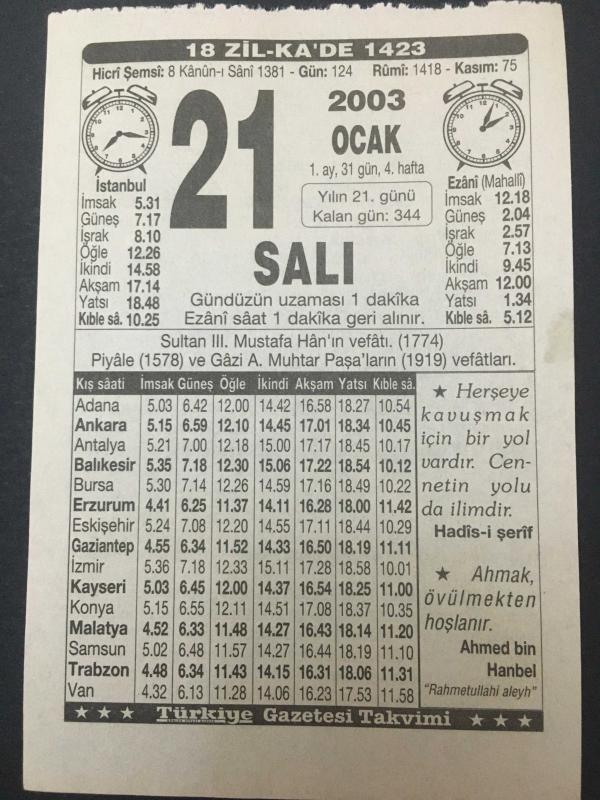 21 OCAK 2003-TAKVİM YAPRAĞI-DOĞUM GÜNÜ HEDİYESİ-TÜRKİYE GAZETESİ TAKVİMİ,3.MUSTAFANIN VEFATI,1774,PİYALE 1578,GAZİ A.MUHTAR PAŞANIN 1919 FEFATLARI,KADINLARIN NAMAZI başlıklı ürün, Efemera, Müzik, Sinema > Belge ve Evraklar > Takvimler kategorisi altında İkinci El olarak satılmaktadır.