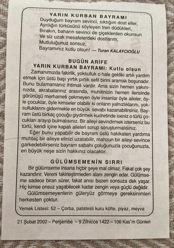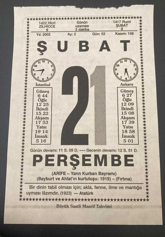 21 ŞUBAT 2002 - TAKVİM YAPRAĞI - DOĞUM GÜNÜ HEDİYESİ - BÜYÜK SAATLİ MAARİF TAKVİMİ - ATATÜRK - TURAN KALAYCIOĞLU - ARİFE - GÜLÜMSEMENİN SIRRI ADLI KISA YAZI, en son 8 ay önce güncellenmiştir.