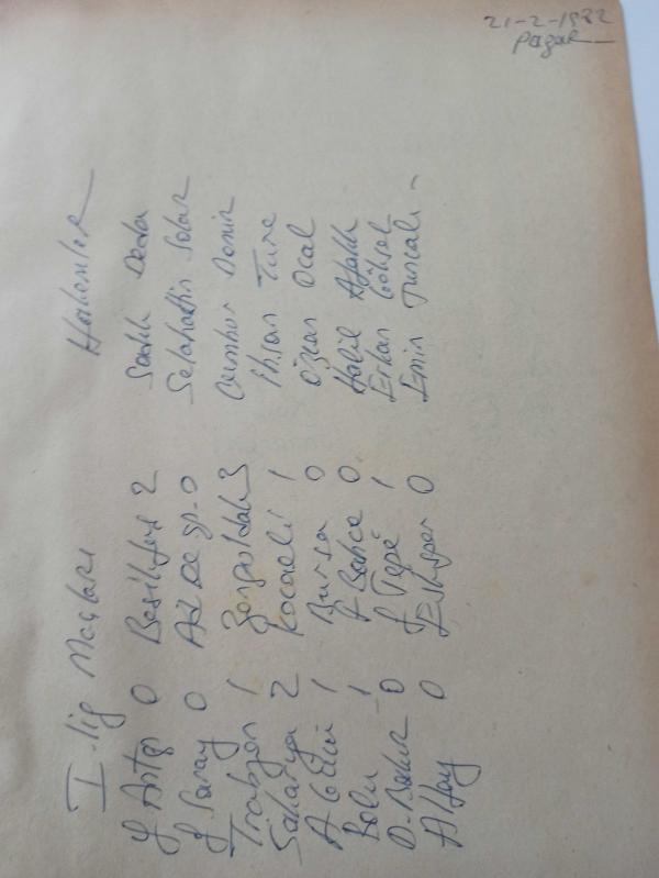 Kitap 1981 yılında yayınlanmıştır. 2 sayfadır. 21 Şubat 1982 - 1.Lig Maçları ve Sonuçları - Maçlardan atılan goller ve oyuncular - Gaziantep 0 Beşiktaş 2 - Bolu 1 Fenerbahçe 0 - Galatasaray 0 Adana Demirspor 0 fotoğraf ve haberi - Islak kalemle a4 kağıdına yazılmış bilgi notu - Tek Yaprak Arkalı Önlüdür adlı eser Türkçe dilindedir.