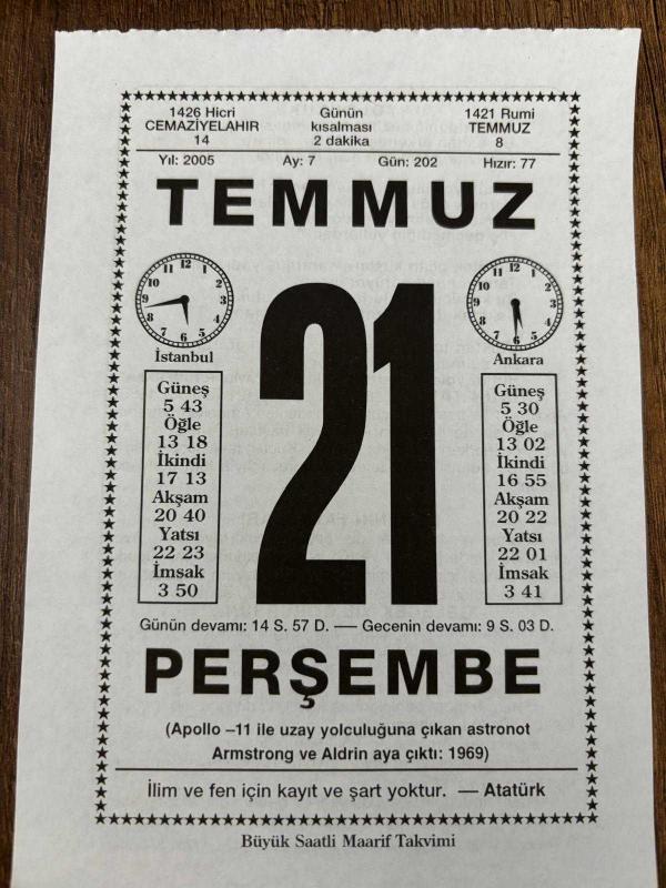 21 TEMMUZ 2005 - TAKVİM YAPRAĞI - DOĞUM GÜNÜ HEDİYESİ - BÜYÜK SAATLİ MAARİF TAKVİMİ - ATATÜRK - CAVİDAN TÜMERKAN - APOLLO-11 AYA AYAK BASTI - ELMANIN FAYDALARI, en son 8 ay önce güncellenmiştir.