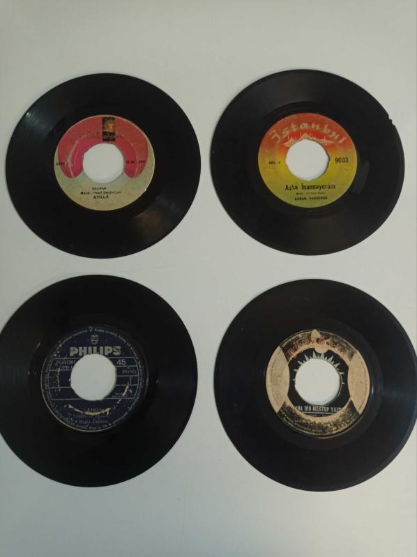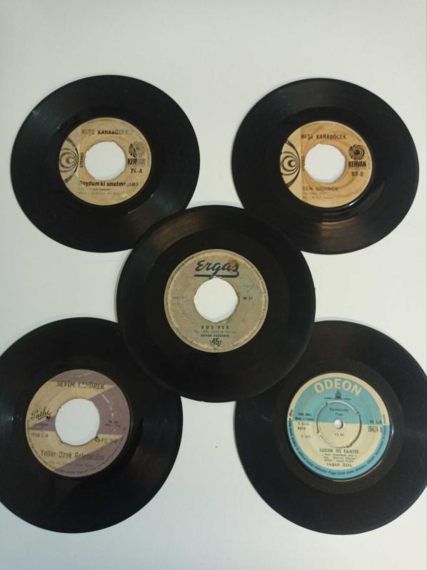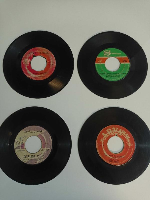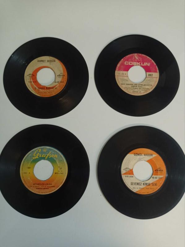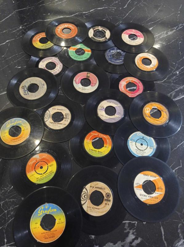 Toplam 21 adet 45 lik plak Kondisyonlar 6.5/7/7+(hafif çıtırtılı) Çoğu bilindik sanatçılar İçlerinde defolu, bombeli plak yoktur.