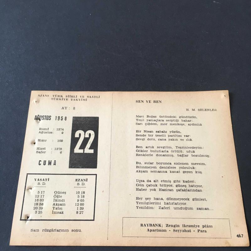 22 AĞUSTOS 1958 -TAKVİM YAPRAĞI-DOĞUM GÜNÜ HEDİYESİ-AJANS-TÜRK ŞİİRLİ VE SAATLİ TÜRKİYE TAKVİMİ,H.M.SELENLER,GÜNGÖR ÖZMEN,FAL,FIKRA,JAPONYANIN KOREYİ İŞGALİ 1910,NAPOLEONUN FRANSAYA DÖNÜŞÜ 1799,GÜZEL SÖZ,YEMEK LİSTESİ başlıklı ürün, Efemera, Müzik, Sinema > Belge ve Evraklar > Takvimler kategorisi altında İkinci El olarak satılmaktadır.