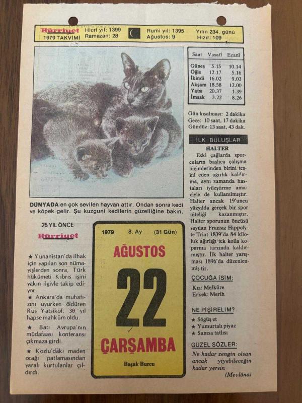 22 AĞUSTOS 1979 - TAKVİM YAPRAĞI - DOĞUM GÜNÜ HEDİYESİ - HÜRRİYET TAKVİMİ - PİS BİR İŞ ROMANI - Şair Orhan Seyfi Orhon'un ölümü (1972) - Barbaros'un Tunus'u fethi (1543), en son 8 ay önce güncellenmiştir.