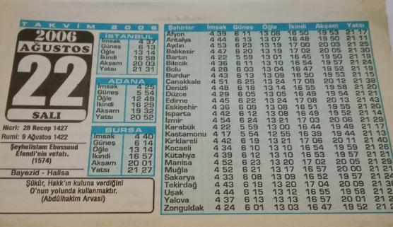 22 Ağustos 2006-Orijinal Takvim Yaprağı-Doğum Günü-Söz,Nişan,Nikâh,Düğün ve Önemli Günler Hediyesi-Bizim Anadolu Takvimleri-Ayet(Abdulhakim Arvasi)-Şeyhülislam Ebussuud Efendi'nin vefatı(1574)-Bayezid-Halisa-Güzel Kıraat, en son 2 ay önce güncellenmiştir.