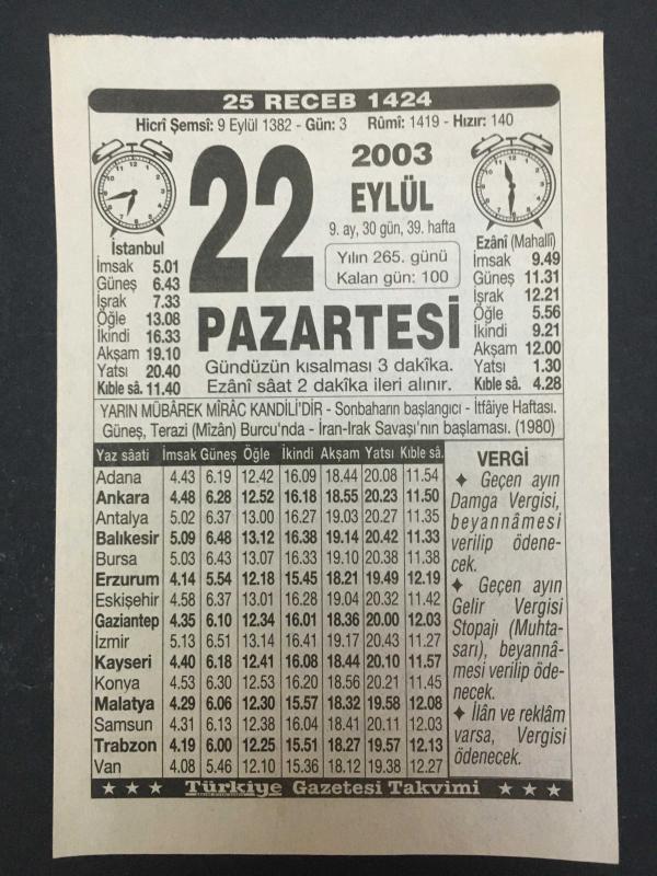 22 EYLÜL 2003-TAKVİM YAPRAĞI-DOĞUM GÜNÜ HEDİYESİ-TÜRKİYE GAZETESİ TAKVİMİ,SONBAHARIN BAŞLANGICI,İTFAİYE HAFTASI,İRAN İRAK SAVAŞININ BAŞLAMASI 1980,MÜBAREK GECELER, en son 8 ay önce güncellenmiştir.