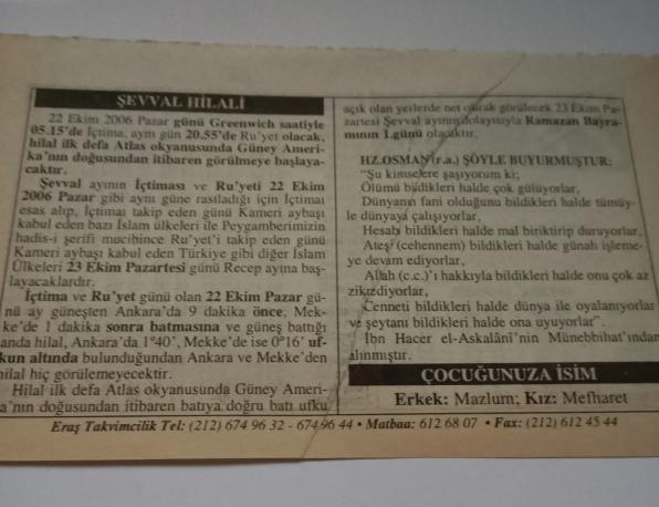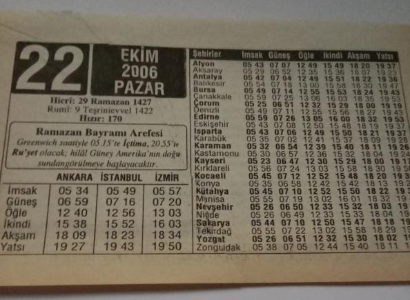 22 Ekim 2006-Orijinal Takvim Yaprağı-Doğum Günü-Söz,Nişan,Nikâh,Düğün ve Önemli Günler Hediyesi-ERAŞ Hizmet Takvimi-Ayet-Hadis(Ramazan Bayramı Arefesi)-Şevval Hilali-Hz.Osman Şöyle Buyurmuştur-Çocuğunuza İsim:Mazlum,Mefharet, en son 3 ay önce güncellenmiştir.