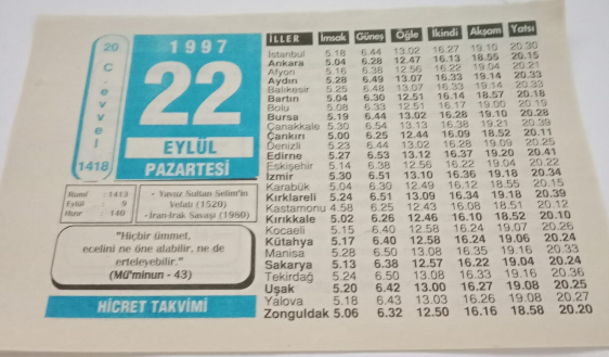 22 Eylül 1997-Orijinal Takvim Yaprağı-Doğum Günü-Söz,Nişan,Nikâh,Düğün ve Önemli Günler Hediyesi-Hicret Takvimi-Ayet(Hadis)-(Mü'minun-43)-Yavuz Sultan Selim'İn Vefatı(1520)-Hz.Geylani(K.s.)-Bazı Sorular-Hz.Ali(R.a.)), en son 8 gün önce güncellenmiştir.