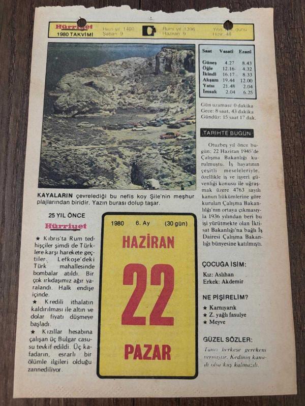 22 HAZİRAN 1980 - TAKVİM YAPRAĞI - DOĞUM GÜNÜ HEDİYESİ - HÜRRİYET TAKVİMİ - DESTAN GİBİ ADLI ROMAN - Sakarya 'da Sapanca nın kurtuluş günü - Montreux Konferansı'nın toplanması (1936) - 2. Sultan Ahmet in tahta çıkışı (1691) başlıklı ürün, Efemera, Müzik, Sinema > Belge ve Evraklar > Takvimler kategorisi altında İkinci El olarak satılmaktadır.