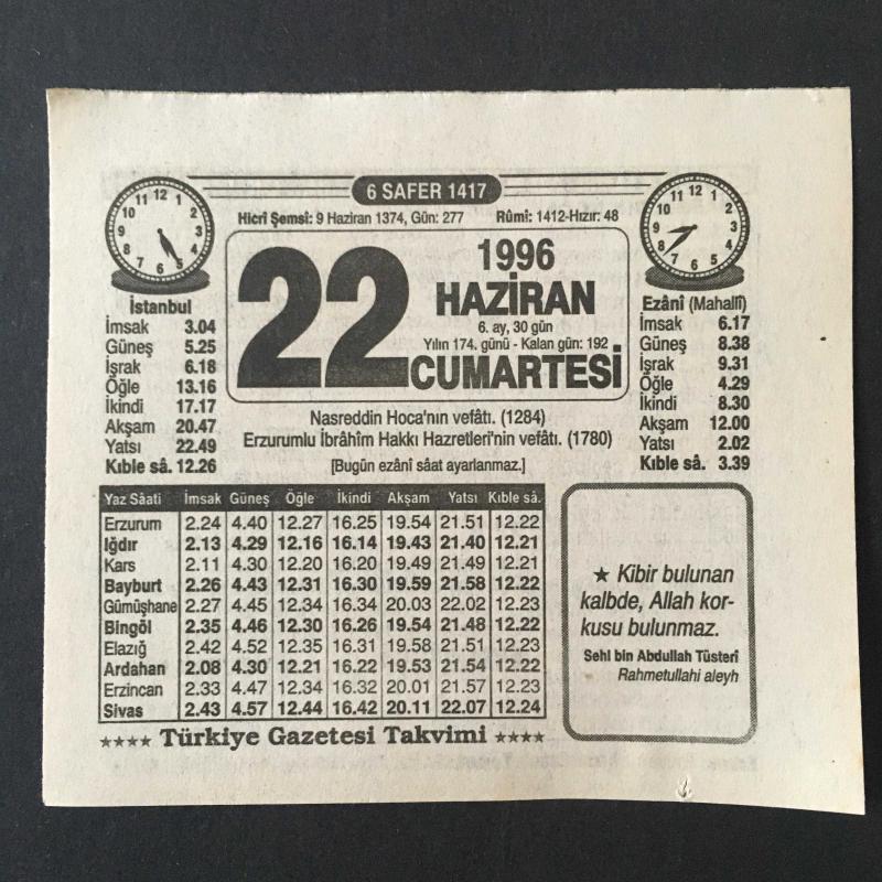 22 HAZİRAN 1996 -TAKVİM YAPRAĞI-DOĞUM GÜNÜ HEDİYESİ-TÜRKİYE GAZETESİ TAKVİMİ,NASRETTİN HOCANIN VEFATI 1284,ERZURUMLU İBRAHİM HAKKI HZ VEFATI 1780,ÖKÜZÜN BAŞI,NASRETTİN HOCA, en son 8 ay önce güncellenmiştir.