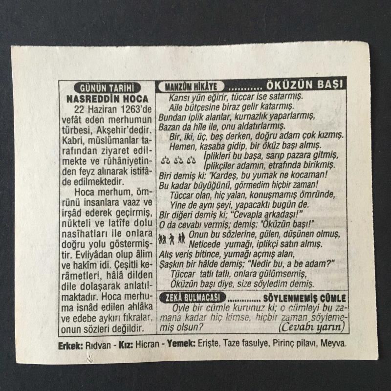 22 HAZİRAN 1996 -TAKVİM YAPRAĞI-DOĞUM GÜNÜ HEDİYESİ-TÜRKİYE GAZETESİ TAKVİMİ,NASRETTİN HOCANIN VEFATI 1284,ERZURUMLU İBRAHİM HAKKI HZ VEFATI 1780,ÖKÜZÜN BAŞI,NASRETTİN HOCA başlıklı ürün, Efemera, Müzik, Sinema > Belge ve Evraklar > Takvimler kategorisi altında İkinci El olarak satılmaktadır.