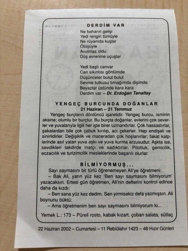 22 HAZİRAN 2002 - TAKVİM YAPRAĞI - DOĞUM GÜNÜ HEDİYESİ - BÜYÜK SAATLİ MAARİF TAKVİMİ - ATATÜRK - DR.ERDOĞAN TANALTAY - YENGEÇ BURCUNDA DOĞANLAR - BİLMİYORMUŞ ADLI YAZI, en son 8 ay önce güncellenmiştir.