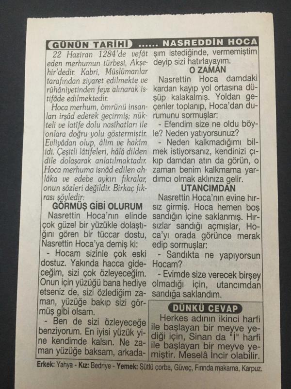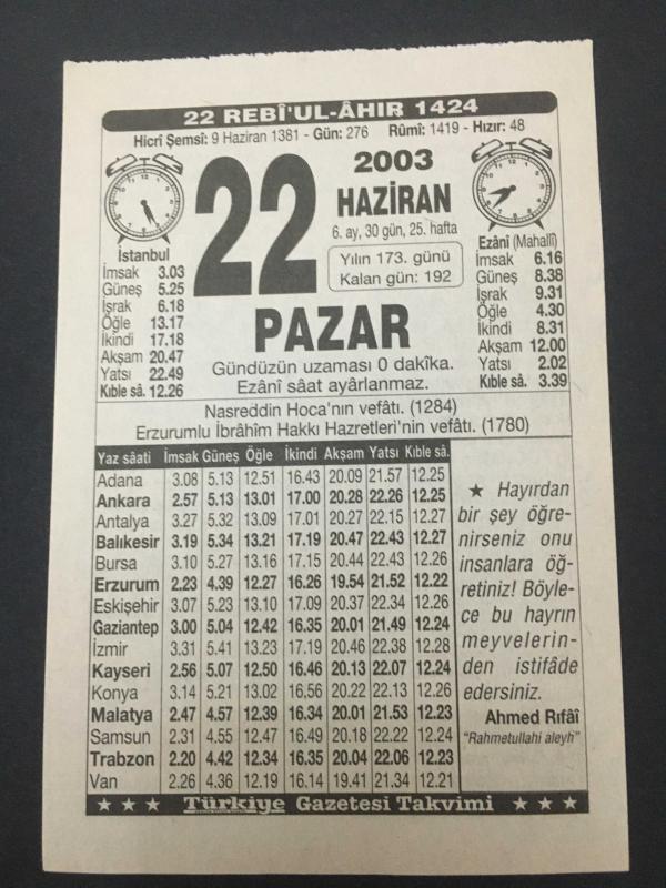 22 HAZİRAN TAKVİM YAPRAĞI-DOĞUM GÜNÜ HEDİYESİ-TÜRKİYE GAZETESİ TAKVİMİ,NASRETTİN HOCANIN VEFATI 1284,ERZURUMLU İBRAHİM HAKKI HAZRETLERİNİN VEFATI,1780,NASRETTİN HOCA, 1 yıl önce satışa sunulmuştur.