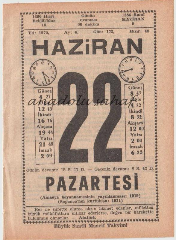 22 Haziran 1970 / Büyük Saatli Maarif Takvimi