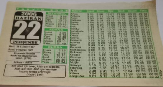 22 Haziran 2006-Orijinal Takvim Yaprağı-Doğum Günü-Söz,Nişan,Nikâh,Düğün ve Önemli Günler Hediyesi-Bizim Anadolu Takvimleri-Ayet-Hadis(Hadis-I Şerif)(Erzurumlu ibrahim Hakkı'mın Hazretlerinin vefatı.(1780))-Abbas - Adile-Sultan İkinci Süleyman-Bill Gates, en son 2 ay önce güncellenmiştir.