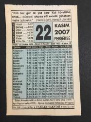 22 KASIM 2007 -TAKVİM YAPRAĞI-DOĞUM GÜNÜ HEDİYESİ-FAZİLET TAKVİMİ,SULTAN AHMED İN VEFATI VE 1.MUSTAFANIN TAHTA ÇIKIŞI 1617,AŞIK PAŞANIN VEFATI 1333,AĞIZ VE DİŞ SAĞLIĞI HAFTASI 22-27 KASIM,SULTANIN RESULULLAHA HÜRMETİ ,YÜZLERİ AK OLSUN başlıklı ürün, Efemera, Müzik, Sinema > Belge ve Evraklar > Takvimler kategorisi altında İkinci El olarak satılmaktadır.