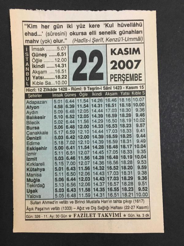 22 KASIM 2007 -TAKVİM YAPRAĞI-DOĞUM GÜNÜ HEDİYESİ-FAZİLET TAKVİMİ,SULTAN AHMED İN VEFATI VE 1.MUSTAFANIN TAHTA ÇIKIŞI 1617,AŞIK PAŞANIN VEFATI 1333,AĞIZ VE DİŞ SAĞLIĞI HAFTASI 22-27 KASIM,SULTANIN RESULULLAHA HÜRMETİ ,YÜZLERİ AK OLSUN, en son 8 ay önce güncellenmiştir.