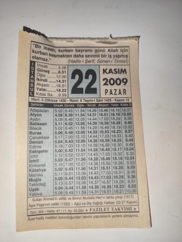 22 Kasım 2009-Orijinal Takvim Yaprağı-Doğum Günü-Söz,Nişan,Nikâh,Düğün ve Önemli Günler Hediyesi-Fazilet Takvimi-Ayet(Hadis)(Hadis-i Şerif, Sünen-i Tirmizi)-Sultan Ahmed'in Vefatı Ve Birinci Mustafa Han'ın Tahta Çıkışı (1617)-Kurban Nasıl Kesilir? başlıklı ürün, Efemera, Müzik, Sinema > Belge ve Evraklar > Takvimler kategorisi altında İkinci El olarak satılmaktadır.