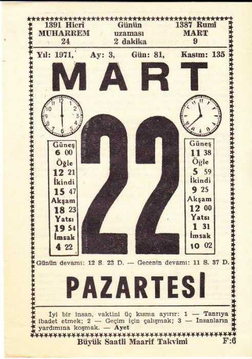 22 MART 1971 SAATLİ MAARİF TAKVİMİ YAPRAĞI, 4 yıl önce satışa sunulmuştur.