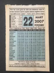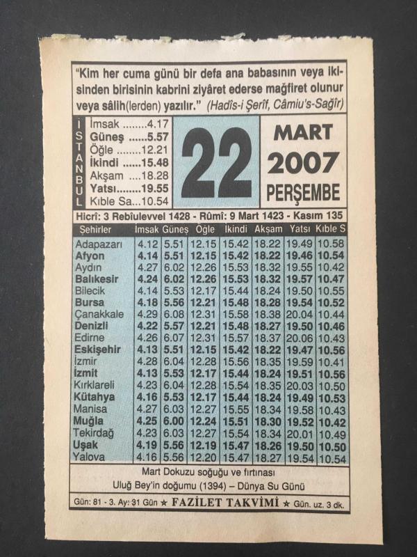 22 MART 2007 -TAKVİM YAPRAĞI-DOĞUM GÜNÜ HEDİYESİ-FAZİLET TAKVİMİ,MART DOKUZU SOĞUĞU VE FIRTINASI,ULUĞ BEYİN DOĞUMU 1394,DÜNYA SU GÜNÜ,FAZLA TUZ MİDE KANSERİ SEBEBİSÜNNETLER,