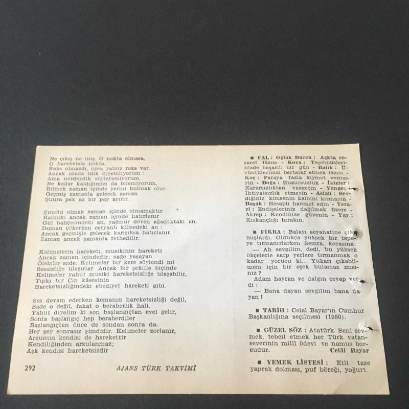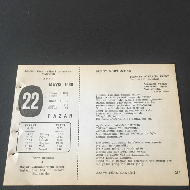 22 MAYIS 1960-TAKVİM YAPRAĞI-DOĞUM GÜNÜ HEDİYESİ- AJANS TÜRK-ŞİİRLİ VE SAATLİ TAKVİMİ,THOMAS,STEARNS ELİOT,FAL,FIKRA,CELAL BAYARIN CUMHURBAŞKANLIĞINA SEÇİLMESİ 1950,GÜZEL SÖZ,YEMEK LİSTESİ, 1 yıl önce satışa sunulmuştur.