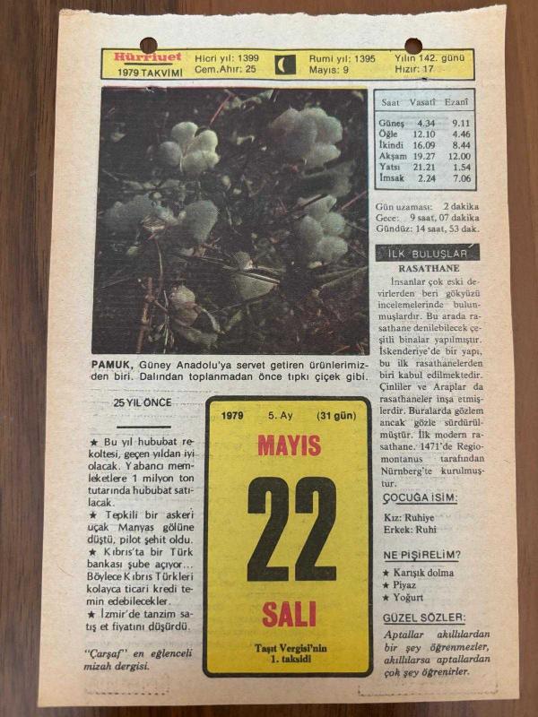 22 MAYIS 1979 - TAKVİM YAPRAĞI - DOĞUM GÜNÜ HEDİYESİ - HÜRRİYET TAKVİMİ - ÖLÜM TANRISI ROMANI - Balıkesir ve Kurtdere panayırları - Nene Hatun'un ölümü (1955) - Şair Eşref'in ölümü (1912), en son 8 ay önce güncellenmiştir.