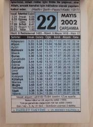 22 MAYIS 2002 ÇARŞAMBA- TAKVİM YAPRAĞI - DOĞUM GÜNÜ HEDİYESİ - FAZİLET TAKVİMİ -NENE HATUN'UN 98 YAŞINDA VEFATI (1955)-TÜRKİYE GENELİNDE OLAĞANÜSTÜ HAL İLAN EDİLDİ (1940)-''HERKES NİYETİNE GÖRE DİRİLTİLİR'' başlıklı ürün, Efemera, Müzik, Sinema > Belge ve Evraklar > Takvimler kategorisi altında İkinci El olarak satılmaktadır.