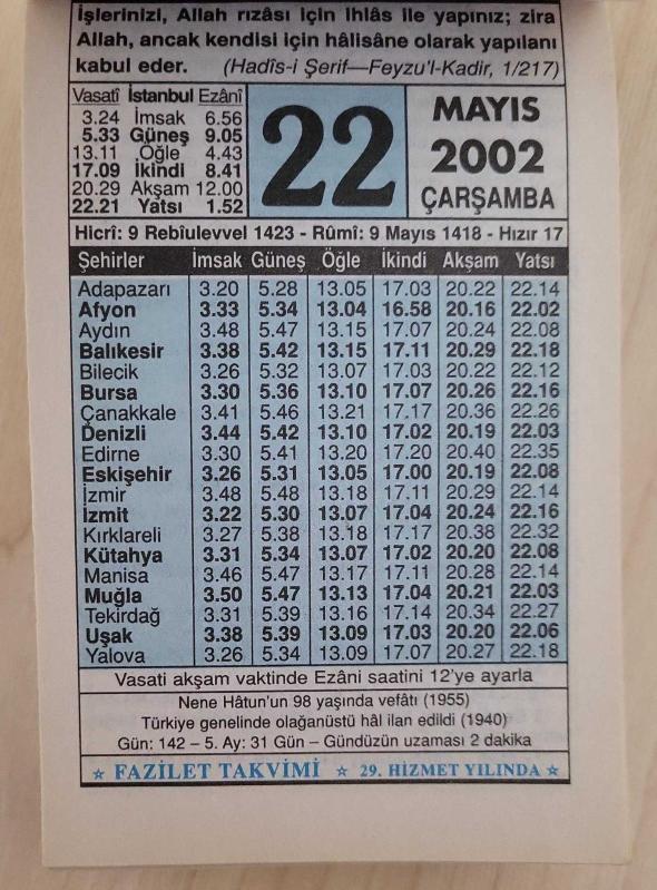 22 MAYIS 2002 ÇARŞAMBA- TAKVİM YAPRAĞI - DOĞUM GÜNÜ HEDİYESİ - FAZİLET TAKVİMİ -NENE HATUN'UN 98 YAŞINDA VEFATI (1955)-TÜRKİYE GENELİNDE OLAĞANÜSTÜ HAL İLAN EDİLDİ (1940)-''HERKES NİYETİNE GÖRE DİRİLTİLİR'', en son 6 ay önce güncellenmiştir.