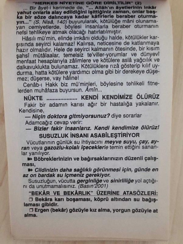 Kitapsız hayat kör,sağır,dilsiz yaşatmaktır.Kitap,zekayı kibarlaştırır.Kitaplar beni ortaya çıkardı.Milletlerin aklı,kitapla gelişir ve büyür.Kimler fazla okuyorsa,az okuyanlara hükmeder.Okumadan geçen bir gün,kaybedilmiş bir gündür.Söz uçar,yazı kalır.Yazı ile saptanmayan her şey,kaybolmuş demektir.Alem unutmuş,kalem (kitap) unutmamış.Bir kitabın içinde birçok ülkeler gezebilirsiniz.En iyi kitapları önceden okuyunuz,çünkü hepsini okuma fırsatını bulamayabilirsiniz.Bizde kitap baş üstünde taşınacak kadar makbuldur.Yazılı kağıdın üzerine basılmaz bile.”Hacı hacıyı Mekke’de,derviş dervişi tekkede bulur,demişler.Alim de alimi bizim çarşıda bulur.”Pirimiz Arslan Kaynardağ’dır,Nizamettin Aktuç’tur,Raif Yelkenci’dir.Gutemberg (1400-1468) matbaayı buldu.