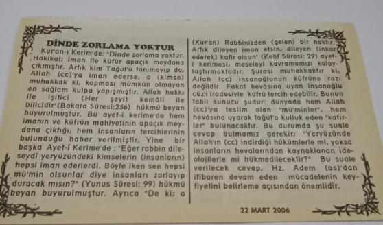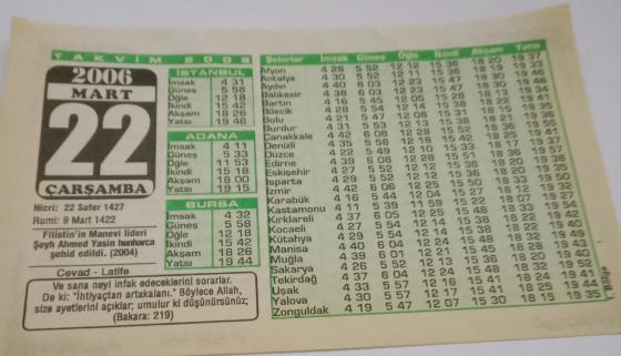 22 Mart 2006-Orijinal Takvim Yaprağı-Doğum Günü-Söz,Nişan,Nikâh,Düğün ve Önemli Günler Hediyesi-Bizim Anadolu Takvimleri-Ayet-Hadis(Bakara:219)(Filistin'in Manevi lideri Şeyh Ahmed Yasin hunharca şehid edildi(2004))-Cevad,Latife-Dinde Zorlama Yoktur, en son 2 ay önce güncellenmiştir.