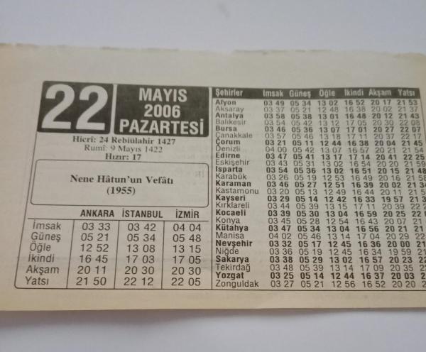 22 Mayıs 2006-Orijinal Takvim Yaprağı-Doğum Günü-Söz,Nişan,Nikâh,Düğün ve Önemli Günler Hediyesi-ERAŞ Hizmet Takvimi-Ayet-Hadis(Nene Hatun'un Vefatı (1955))-Nene Hatun(1857-1955)-Çocuğunuza İsim:Selami,Selda, en son 3 ay önce güncellenmiştir.