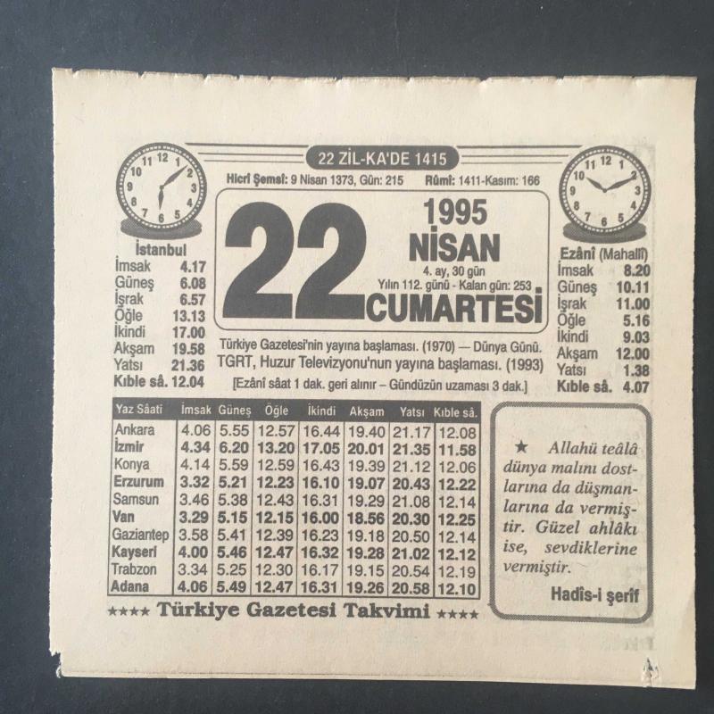 22 NİSAN 1995 -TAKVİM YAPRAĞI-DOĞUM GÜNÜ HEDİYESİ-TÜRKİYE GAZETESİ TAKVİMİ,TÜRKİYE GAZETESİNİN YAYINA BAŞLAMASI,1970,DÜNYA GÜNÜ,TGRT HUZUR TELEVİZYONUN YAYINA BAŞLAMASI 1993, başlıklı ürün, Efemera, Müzik, Sinema > Belge ve Evraklar > Takvimler kategorisi altında İkinci El olarak satılmaktadır.