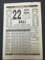 22 NİSAN 2003 -TAKVİM YAPRAĞI-DOĞUM GÜNÜ HEDİYESİ,TÜRKİYE GAZETESİ TAKVİMİ,TÜRKİYE GAZETESİNİN YAYINA BAŞLAMASI,1970,DÜNYA GÜNÜ,TGRT ,HUZUR TELEVİZYONLARININ YAYINA BAŞLAMASI 1993, başlıklı ürün, Efemera, Müzik, Sinema > Belge ve Evraklar > Takvimler kategorisi altında İkinci El olarak satılmaktadır.