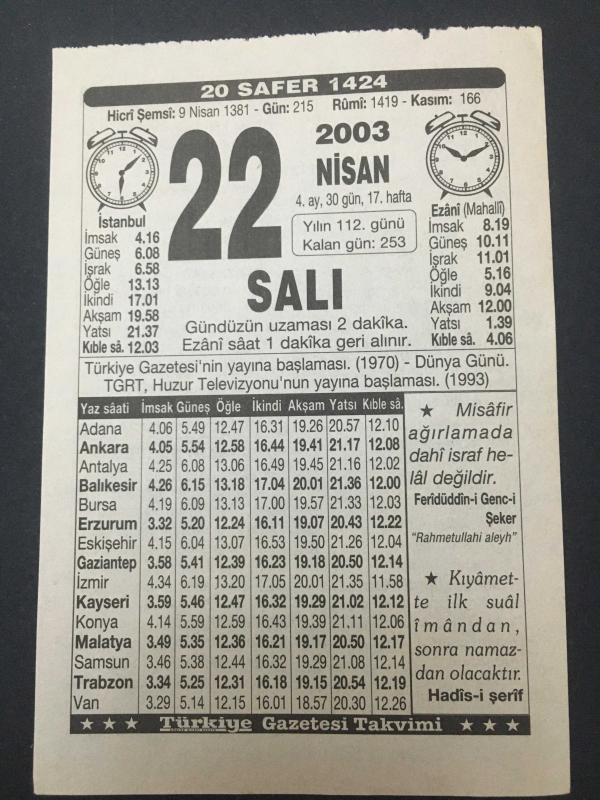 22 NİSAN 2003 -TAKVİM YAPRAĞI-DOĞUM GÜNÜ HEDİYESİ,TÜRKİYE GAZETESİ TAKVİMİ,TÜRKİYE GAZETESİNİN YAYINA BAŞLAMASI,1970,DÜNYA GÜNÜ,TGRT ,HUZUR TELEVİZYONLARININ YAYINA BAŞLAMASI 1993,, en son 8 ay önce güncellenmiştir.