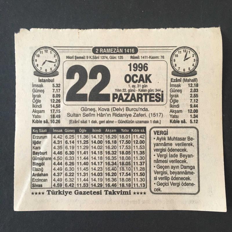 22 OCAK 1996-TAKVİM YAPRAĞI-DOĞUM GÜNÜ HEDİYESİ-TÜRKİYE GAZETESİ TAKVİMİ,YAVUZUN RİDANİYE ZAFERİ 1517,RİDANİYE ZAFERİ ,RAMAZAN MANİLERİ başlıklı ürün, Efemera, Müzik, Sinema > Belge ve Evraklar > Takvimler kategorisi altında İkinci El olarak satılmaktadır.