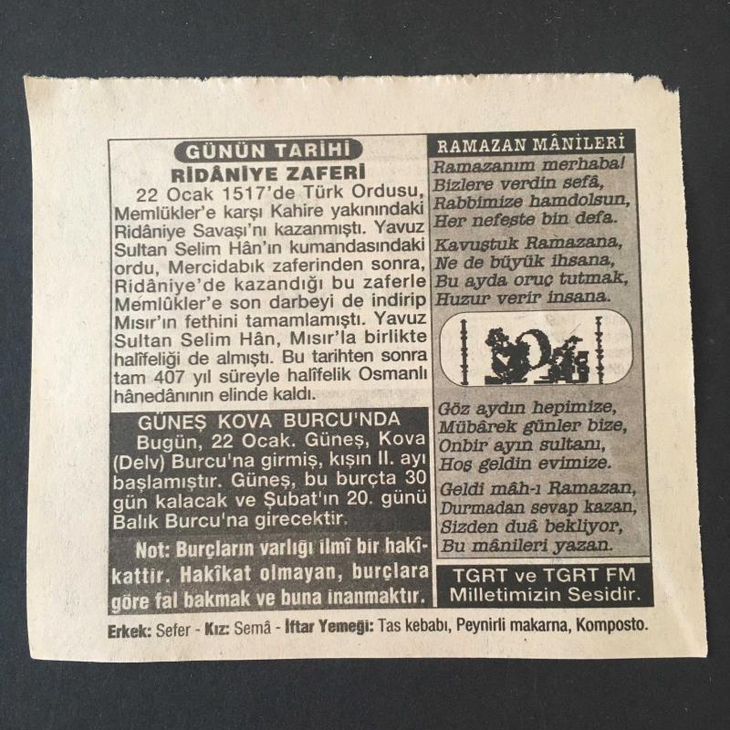 22 OCAK 1996-TAKVİM YAPRAĞI-DOĞUM GÜNÜ HEDİYESİ-TÜRKİYE GAZETESİ TAKVİMİ,YAVUZUN RİDANİYE ZAFERİ 1517,RİDANİYE ZAFERİ ,RAMAZAN MANİLERİ, 1 yıl önce satışa sunulmuştur.