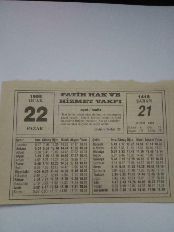 22 Ocak 1995-Orijinal Takvim Yaprağı-Doğum Günü-Söz,Nişan,Nikâh,Düğün ve Önemli Günler Hediyesi-Fatih Hak ve Hizmet Vakfı-Ayet/Hadis(Buhârî,Tevhîd:52)-(Dünden Devam)-S.Demirel-Sarı Sağlık başlıklı ürün, Efemera, Müzik, Sinema > Belge ve Evraklar > Takvimler kategorisi altında İkinci El olarak satılmaktadır.