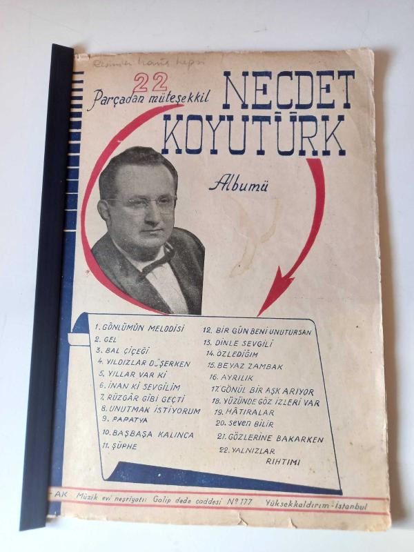 ** 22 PARÇADAN MÜTEŞEKKİL NECDET KOYUTÜRK ALBÜMÜ ** 28.5 x 21 cm.ebadında,sanatçının çeşitli notalarının birleştirilmesiyle biraraya getirilmiş, sol taraftan kıskaçlanarak dosya yapılmış,gayet temiz durumda,notalar kitabı...