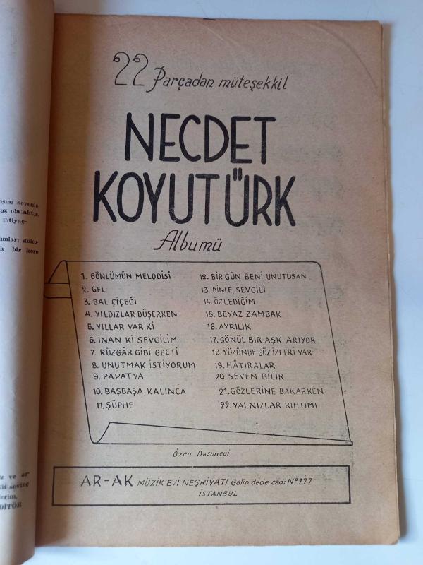 22 PARÇADAN MÜTEŞEKKİL NECDET KOYUTÜRK ALBÜMÜ... başlıklı ürün, Efemera, Müzik, Sinema > Müzik, Plak, Kaset, CD > Nota kategorisi altında İkinci El olarak satılmaktadır.