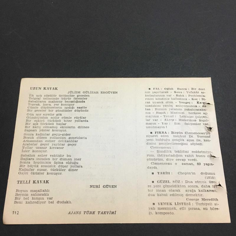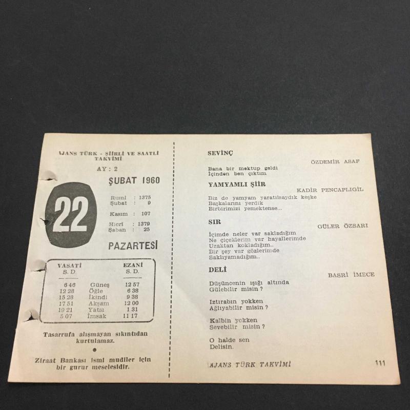 22 ŞUBAT 1960 -TAKVİM YAPRAĞI-DOĞUM GÜNÜ HEDİYESİ-AJANS TÜRK-ŞİİRLİ VE SAATLİ TAKVİMİ,ÖZDEMİR ASAF,KADİR PENCAPLIGİL,GÜLER ÖZSARI,BASRİ İMECE,JULİDA GÜLİZAR ERGÜVEN,NURİ GÜVEN,FAL,FIKRA,FHOPİNİN DOĞUMU 1810,GÜZEL SÖZ,YEMEK LİSTESİ, en son 8 ay önce güncellenmiştir.