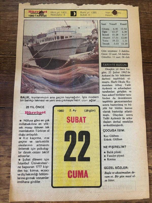 22 ŞUBAT 1980 - TAKVİM YAPRAĞI - DOĞUM GÜNÜ HEDİYESİ - HÜRRİYET TAKVİMİ - VASİYETNAME ADLI ROMAN - Menemen'in işgali (1910) - Erzincan'ın ilçesi Tercan'ın kurtuluşu - "Aydın" şilebinin Kuzey Denizi'nde batışı (1958), 3 ay önce satışa sunulmuştur.