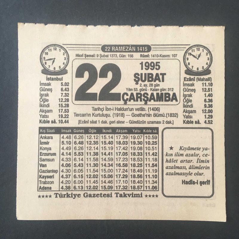 22 ŞUBAT 1995 -TAKVİM YAPRAĞI-DOĞUM GÜNÜ HEDİYESİ-TÜRKİYE GAZETESİ TAKVİMİ,İBN İ HALDUN UN VEFATI 1406,TERCAN IN KURTULUŞU,1918,GOETHE NİN ÖLÜMÜ 1832,HEY GİDİ MARK HEY,ZEYTİNYAĞLI KEREVİZ, 11 ay önce satışa sunulmuştur.