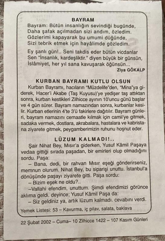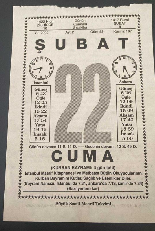 22 ŞUBAT 2002 - TAKVİM YAPRAĞI - DOĞUM GÜNÜ HEDİYESİ - BÜYÜK SAATLİ MAARİF TAKVİMİ - KURBAN BAYRAMI - ZİYA GÖKALP - LÜZUM KALMADI ADLI KISA YAZI