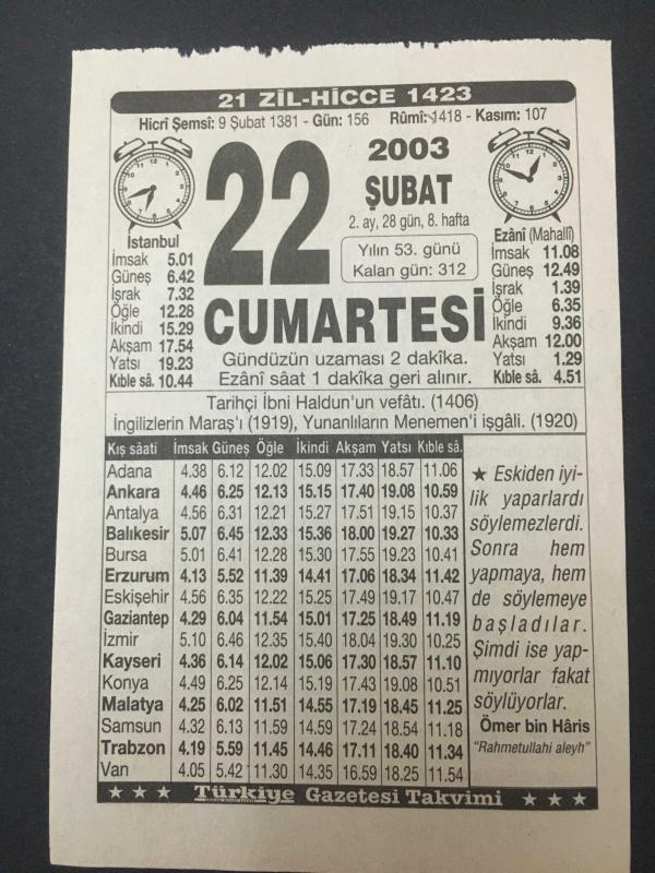 22 ŞUBAT 2003-TAKVİM YAPRAĞI-DOĞUM GÜNÜ HEDİYESİ-TÜRKİYE GAZETESİ TAKVİMİ,İBNİ HALDUNUN VEFATI,1406,İNGİLİZLERİN MARAŞI 1919 YUNANLILARIN MENEMENİ İŞGALİ 1920,OSMANLILARDA İYİLİK VE İNSANİYET0 başlıklı ürün, Efemera, Müzik, Sinema > Belge ve Evraklar > Takvimler kategorisi altında İkinci El olarak satılmaktadır.