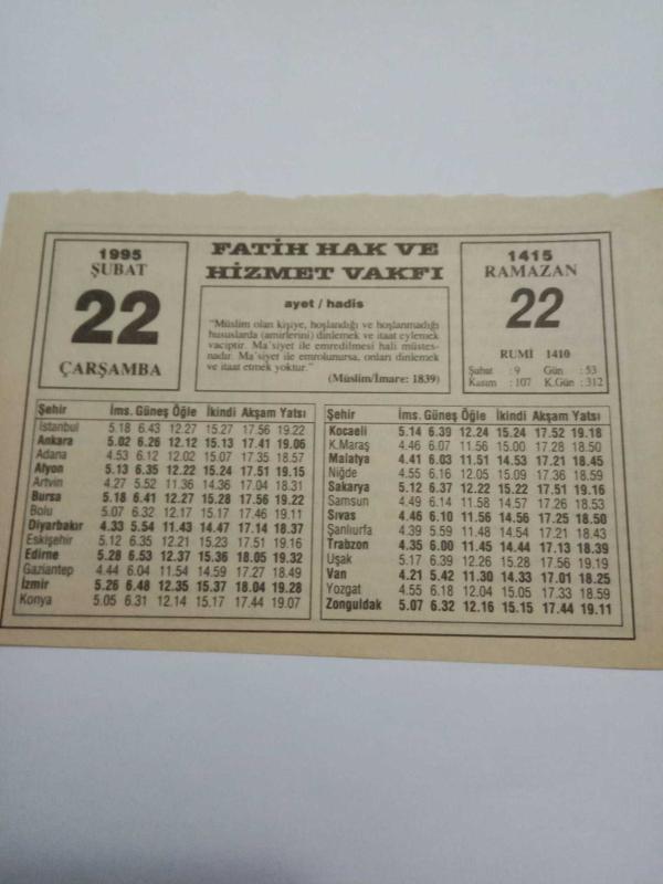 22 Şubat 1995-Orijinal Takvim Yaprağı-Doğum Günü-Söz,Nişan,Nikâh,Düğün ve Önemli Günler Hediyesi-Fatih Hak ve Hizmet Vakfı-Ayet/Hadis(Müslim/İmare:1839)-Toplum Barışı ve Veda Hutbesi-Sözün Özü-Hayvan Tuzağı Akağaç, en son 5 ay önce güncellenmiştir.