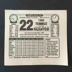 22 TEMMUZ 1996 -TAKVİM YAPRAĞI-DOĞUM GÜNÜ HEDİYESİ-TÜRKİYE GAZETESİ TAKVİMİ,SON 50 YILIN EN SICAK GÜNLERİ 1987,GÜNEŞ ASLAN ESED BURCUNDA EDİRNENİN KURTULUŞU,HASAN ÇAVUŞA ANASINDAN MEKTUB başlıklı ürün, Efemera, Müzik, Sinema > Belge ve Evraklar > Takvimler kategorisi altında İkinci El olarak satılmaktadır.