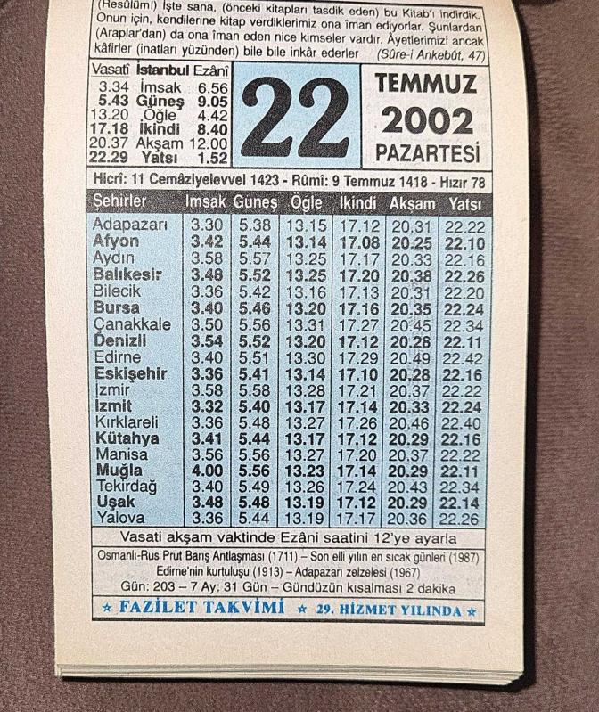 22 TEMMUZ 2002 PAZARTESİ - TAKVİM YAPRAĞI - DOĞUM GÜNÜ HEDİYESİ - FAZİLET TAKVİMİ - OSMANLI-RUS PRUT BARIŞ ANTLAŞMASI (1711)-SON ELLİ YILIN EN SICAK GÜNLERİ (1987)-EDİRNE'NİN KURTULUŞU (1913)-ADAPAZARI ZELZELESİ (1967)-İMANIN ŞARTLARI KİTAPLARA İMAN, en son 6 ay önce güncellenmiştir.