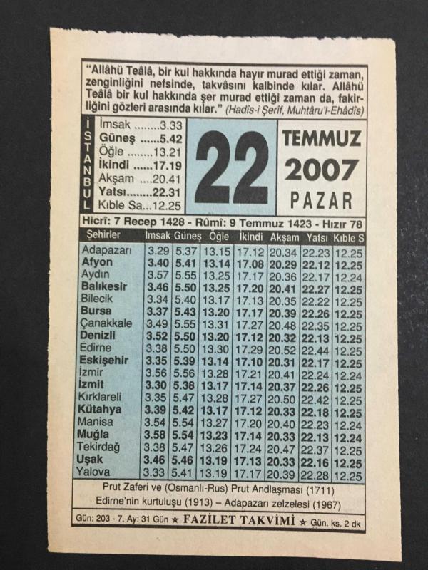 22 TEMMUZ 2007 -TAKVİM YAPRAĞI-DOĞUM GÜNÜ HEDİYESİ-FAZİLET TAKVİMİ,PRUT ZAFERİ VE PRUT ANTLAŞMASI 1711,EDİRNENİN KURTULUŞU 1913,ADAPAZARI ZELZELESİ 1967,LEVHALARIMIZ başlıklı ürün, Efemera, Müzik, Sinema > Belge ve Evraklar > Takvimler kategorisi altında İkinci El olarak satılmaktadır.